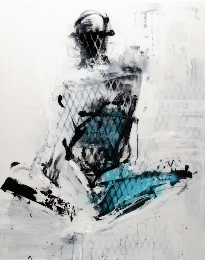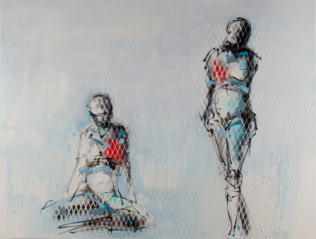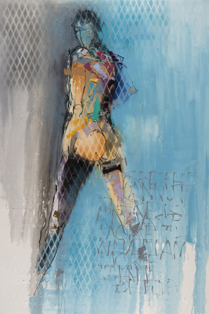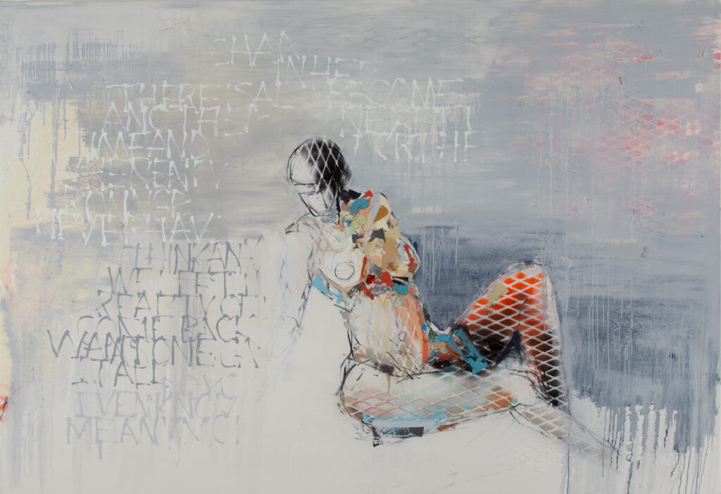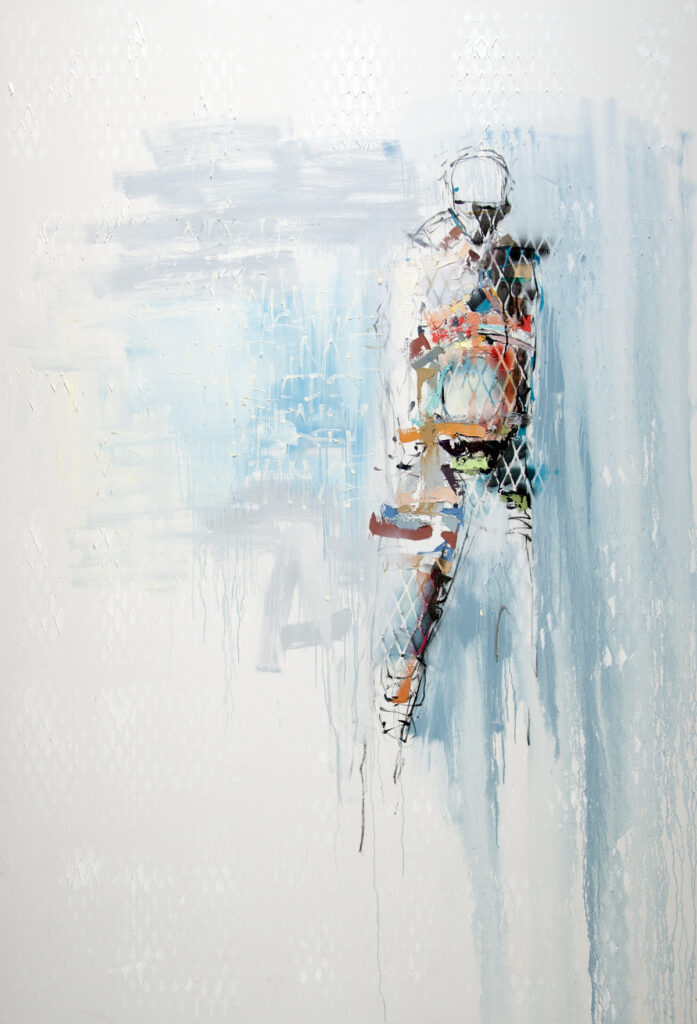 Layered marks, veiled grids, and fractured silhouettes evoke the emotional residue of lives lived forward yet felt in reverse. Each painting is a fragment of projected memory—at once anticipatory and reflective—where the edges of time blur and the self negotiates with its own impermanence.
